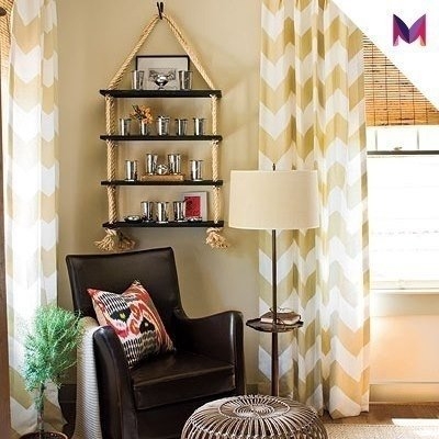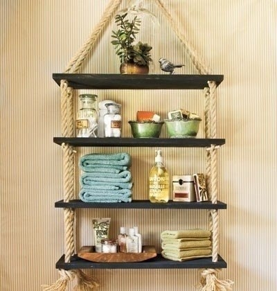 Подвесная полка из дощечек и толстой веревкиПодвесная полка из дощечек и толстой веревки по карману даже тем, кто решил повременить с покупкой готовой.