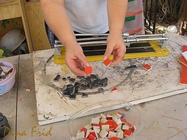 Для работы нам потребуется: - пластиковый таз - мозаика (кусочки плитки) - кусачки - клей ПВА, разбавленный с водой в отношении 1:1 - эскиз, диаметром равный дну таза - ц...
