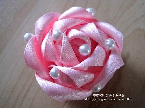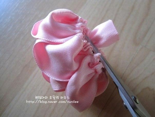 Готовая роза на фото и роза, которая получается в МК - абсолютно разные: на первой розе видно кромку ленты; на розе из МК кромки, сложенные вместе, идут вниз цветка.