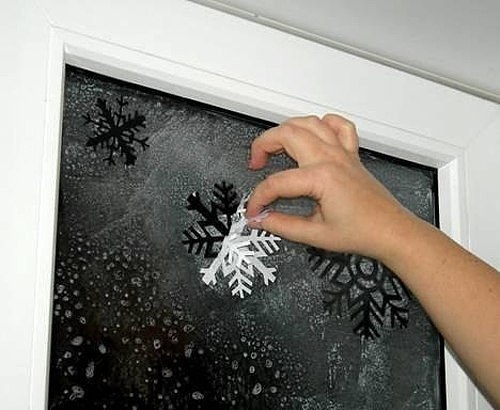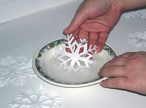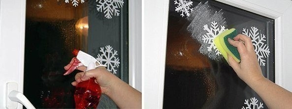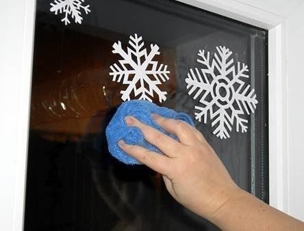 Подождите несколько минут пока паста подсохнет и отклейте бумажные снежинки. Готово! После праздников декор легко смывается водой без каких-либо моющих средств.