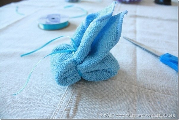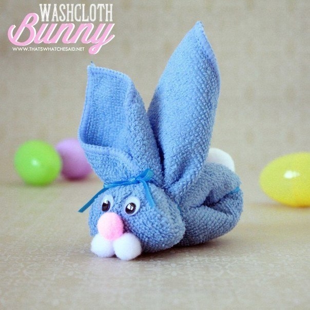 Зайка из полотенцаЕсли полотенца для рук сворачивать таким способом, то они станут украшением ванной комнаты.