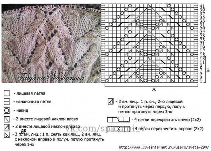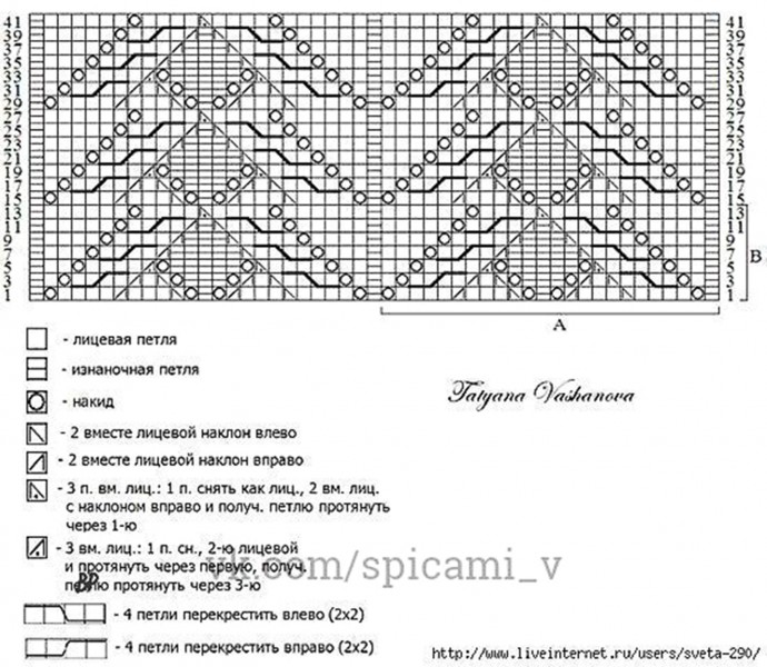 Условные обозначения: треугольник с наклоном вправо - 2 п вместе лиц,с наклоном влево - 1 п снять,след. петля лицевая и надеть на неё снятую петлю. Три штриха соединённые - 3 п. вм...