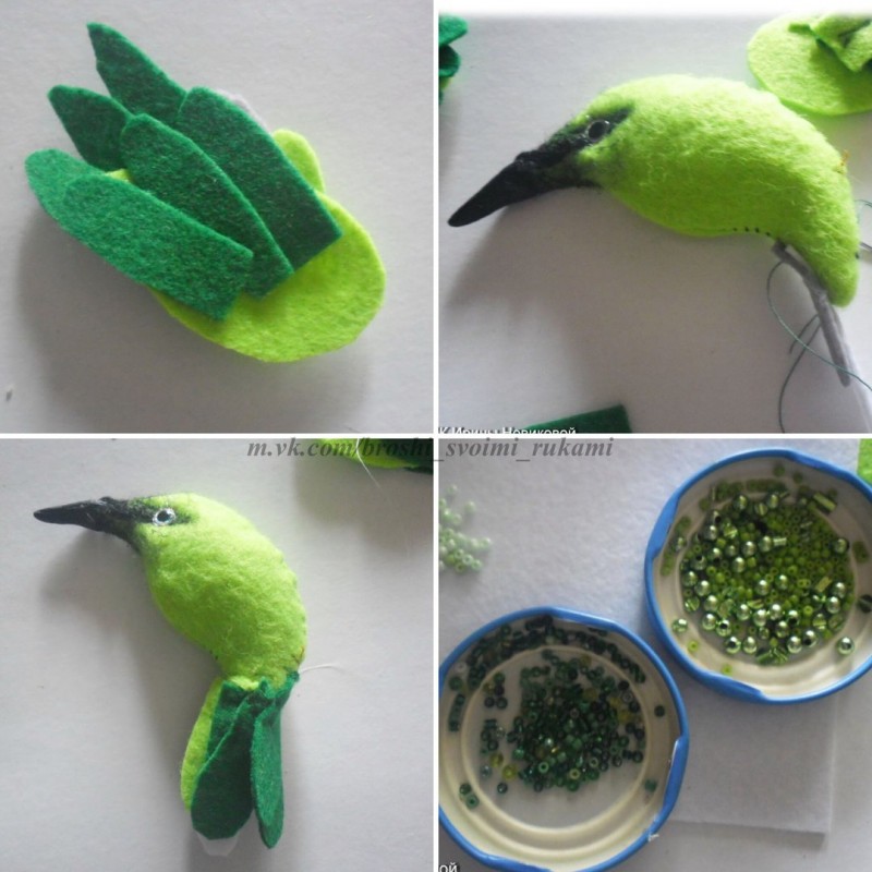 35. Булавку смазываем моментом и приклеиваем задник к изнанке птички. Фетр прекрасно держит форму. Для надежности задник еще и ниточками прошиваем.