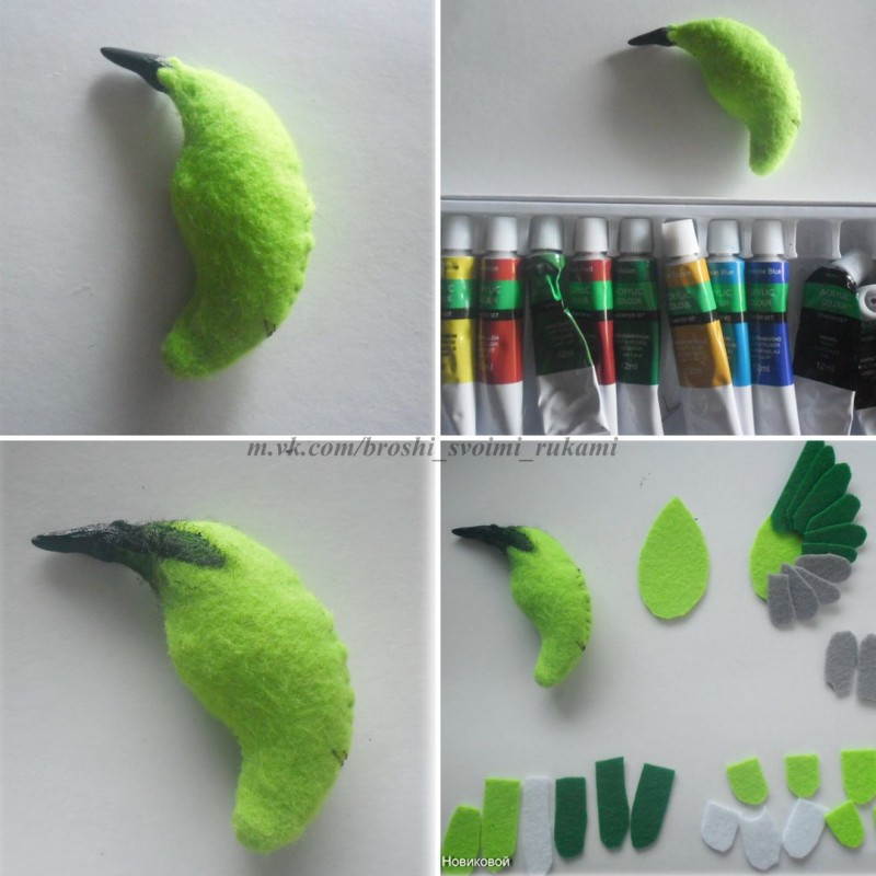 16. Пока клюв сохнет (это занимает 15-20 минут от силы), вырезаем из фетра по приготовленным выкройкам крылья и перья.