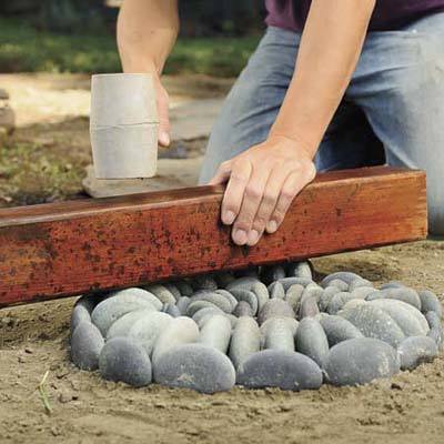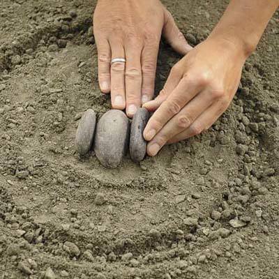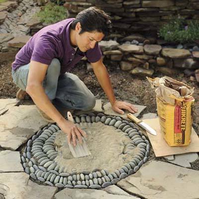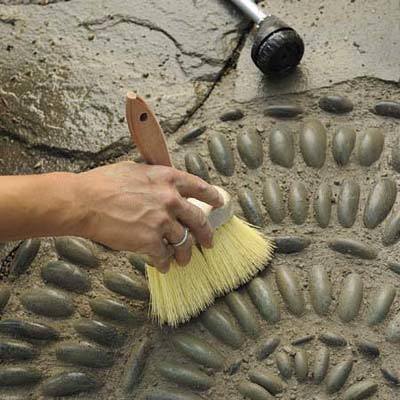 Непонятно, чем он засыпает камни после того как сделает рисунок. Сухим гипсом или бетоном, а потом поливает его? Но после картинки с гипсом появляется картинке, где он вставляет камушки в песок… Какое-то несоответствие…