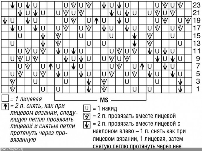 Количество петель кратно 12 + 13 п. + 2 кром. Вязать по приведенной схеме. На ней даны лицевые ряды. В изнаночных рядах петли и накиды провязывать изнаночными. В ширину начинать с кром. и с петель перед раппортом, повторять раппорт, заканчивать петлями после раппорта и кром.