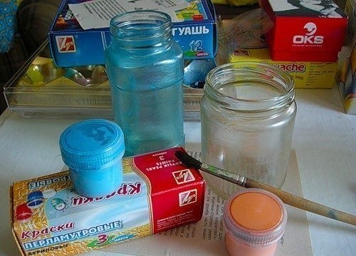 Грунтуем протравленные растворителем баночки акриловыми красками одним слоем.