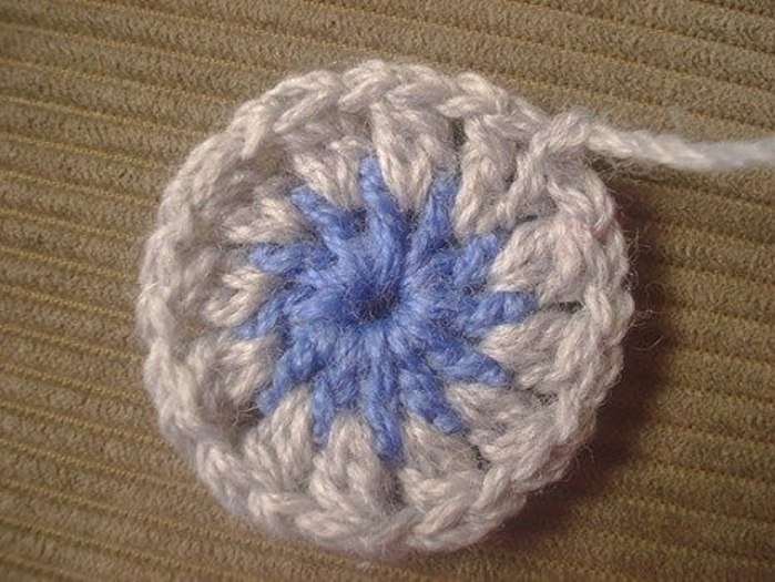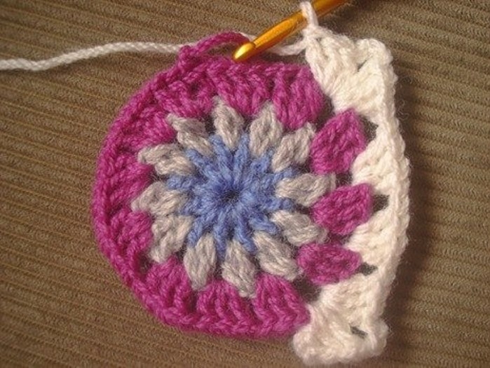 Основным цветом набираем 3 воздушные петли подъема + 2 столбика с накидом, 3 воздушные петли и под эту же арку еще 3 столбика с накидом. Теперь под каждую арку предыдущего ряда 3 столбика с накидом (через каждые 3 арки провязывайте 6 столбиков а между ними 3 воздушные петли до конца ряда, для формирования квадрата).