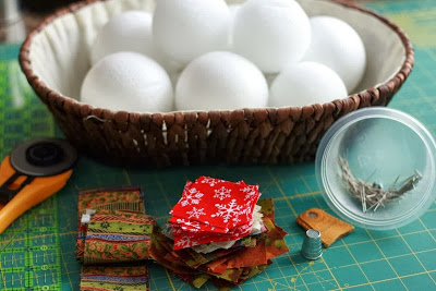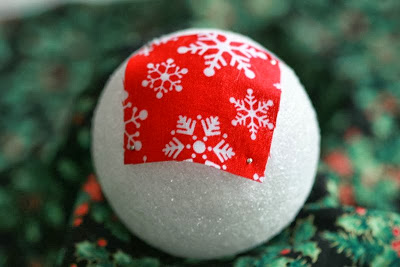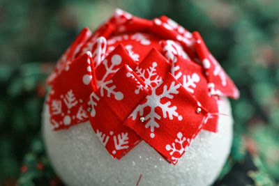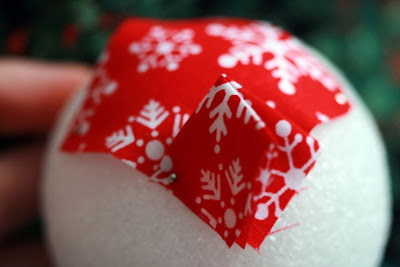 Интересный елочный шар-шишка создается из пенопластового шара, ткани и булавок.