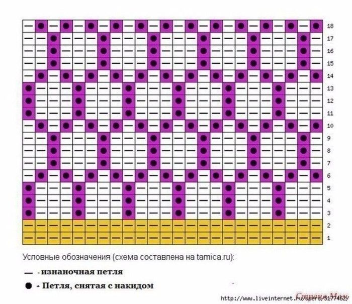 Число петель кратно 4+2 кромочные. Первые два ряда – подготовительные.