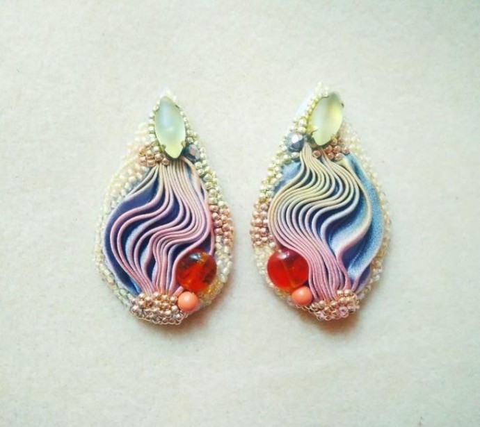 Изготовление роскошного украшения с шелковой лентой шибори может быть использована для составления комплекта: кулон и серьги, например.