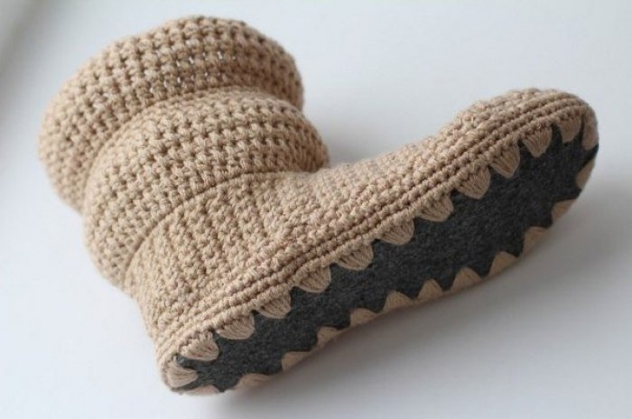 1. Вяжу сапожок в две нитки, а можно даже в три. Обвязала подошву. Сверху провязала еще два ряда. Затем вывернула вязание на другую сторону (показалось так аккуратней).
