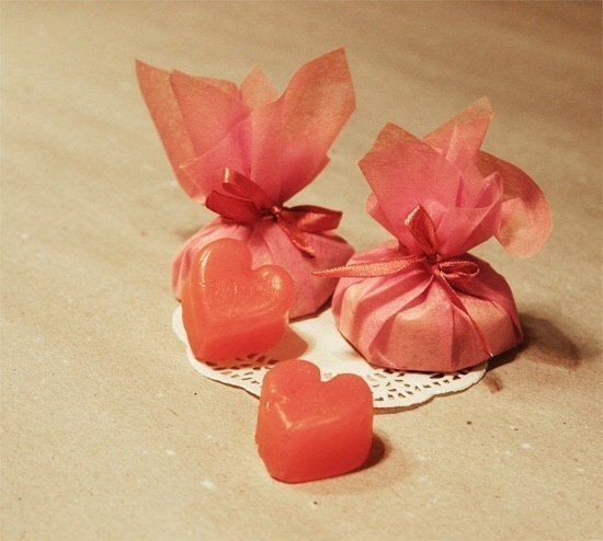 8) Сделаем красивые кулечки с бантиком. Нам понадобится небольшой кусочек ткани (я использую упаковочный материал для флористов). Нарезаем квадратные кусочки и кладем наше мыло в центр. Сворачиваем края кверху и перевязываем красивой лентой.
