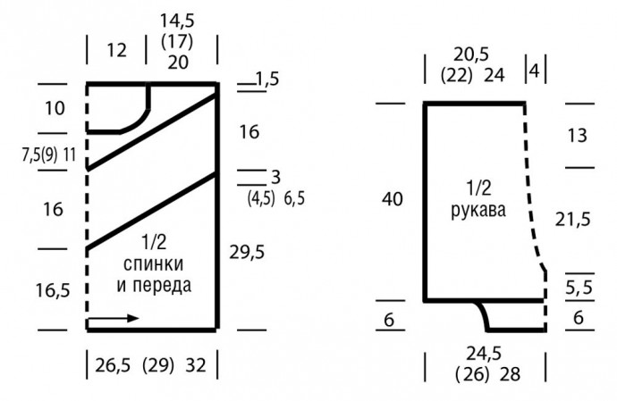 Начиная с правого бокового края, вязать аналогично, но с горловиной. Для этого через 14,5 см = 22 ряда (17 см = 26 рядов) 20 см = 30 рядов от начального ряда закрыть по левому краю 1 x 6 п., затем убавить в каждом 2-м ряду 6 x 1 п., далее связать еще 4 ряда без убавок.