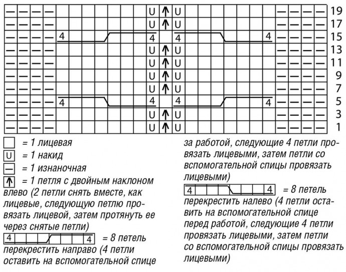 (на 25 петель) Вязать согл. схеме. На ней даны лицевые ряды. В изнаночных рядах все петли провязывать по рисунку, накиды провязывать изнаночными.