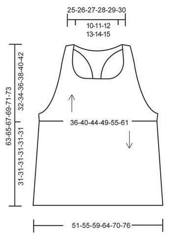 Авторы модели предлагают вязать майку из пряжи DROPS COTTON LIGHT, имеющей состав из хлопка и полиэстера в равных долях. Пряжа реализуется в мотках 50 г/105 м, и таких мотков нам потребуется 7-7-8-9-9-10.