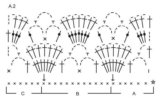 ЛС: выполняем 6 пет по А.2А; потом выполняем 132-156-168-180-204-228 пет по А.2; заканчиваем ряд шестью петлями схемы А.2С. Выполняем вертикальный раппорт по А.2. В последнем ряду делаем 1 стлб/соед (соединительный), с его помощью замкнув круг. Далее вяжем так, как описано ниже. Круг 1: 3 вп; пропускаем очередные 2 стлб/с2н; вяжем по АВ.
