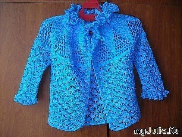 Сборка: выполнить боковые швы и нижние швы рукавов. Вырез горловины обвязать рюшем. По нижнему краю рукавов выполнить по 1 ряду столбиков без накида и рюша. Вертикальные края полочек и низ жакета обвязать 1-м рядом столбиков без накида. Атласную ленту продеть сквозь отверстия в первом ряду каймы. Связать две «шишечки» и пришить их к полочкам.
