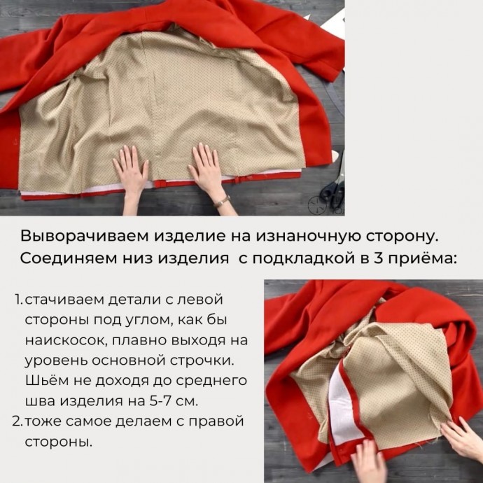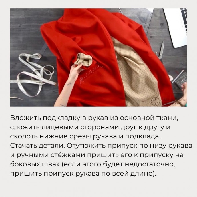 - выкроить детали подкладки, стачать и обработать боковые, плечевые швы, вытачки, складки, втачать рукава.