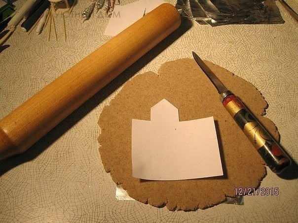 Стены уже достаточно подсохли, можно собрать то, что у нас получилось. При помощи жгутиков теста скрепляем стены и оставляем сушиться до завтра. Теперь крыша. В тесто из пшеничной муки добавляем коричневую, красную и жёлтую акриловую краски до нужного оттенка. Выкраиваем заготовки, даём подсушиться с двух сторон и также приклеиваем жгутиками теста, не забывая увлажнять места соединения.