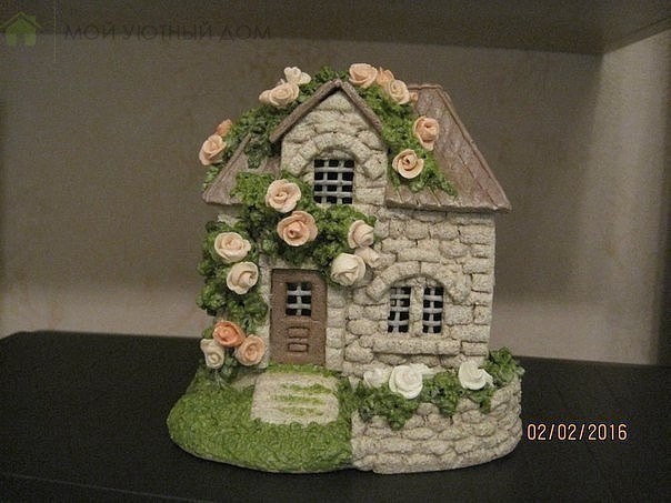 Приклеиваем наш домик клеем ПВА на подставку из тонкого пенопласта (в данном случае это потолочная плитка), нижняя её сторона укрыта тонким слоем раскатанного теста. Закрываем сверху подставочку тонким слоем теста. А дальше начинается самое интересное. Украшаем, декорируем по своему усмотрению, делаем наш домик живым, обитаемым. Оставляем сушиться, затем покрываем акриловым матовым лаком и любуемся тем, что у нас получилось. Окончательная сушка 5-7 дней, за это время можно придумать домику пару, будет коллекция, которой нет ни у кого.