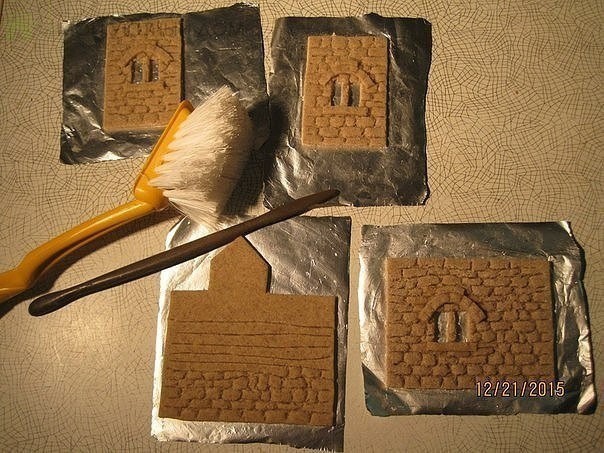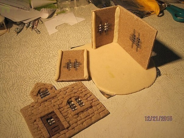 Создаём фактуру на раскатанном тесте при помощи жёсткой щётки, вырезаем заготовки и стекой создаём имитацию кирпичиков, прорезаем окна, сделаем несложный декор из полосочек того же теста. Поскольку домик "каменный", то и декор должен выглядеть соответствующе. Прикрепляем его при помощи легкого смачивания кисточкой с водой.Вообще декора никогда не бывает много. Оставляем подсушиваться. Когда лицевая сторона заготовок подсохнет, аккуратно переворачиваем их и делаем оконную раскладку тоненькими жгутиками теста, также прикрепляя их влажной кисточкой. Воды не должно быть много. Периодически переворачиваем заготовки, чтобы равномерно подсушивались обе стороны.