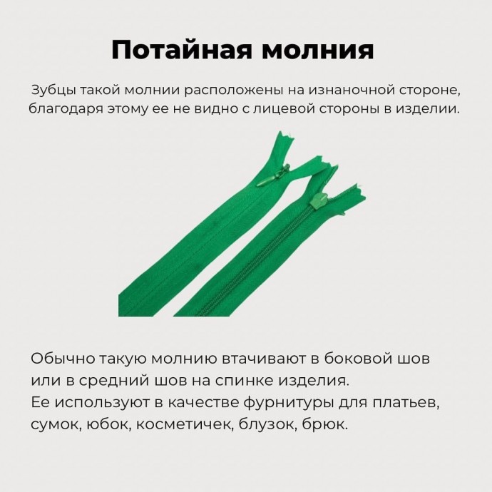 - Неразъемные молнии, они расстёгиваются только до нижнего ограничителя. Используют при пошиве платьев, юбок, брюк, сумок и в подушках.
