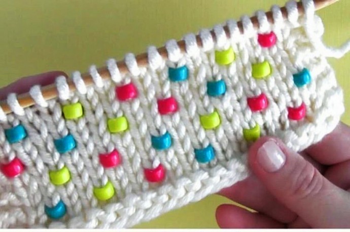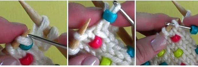 Ввязывание крупных бусин в полотно на спицах делается крючком.