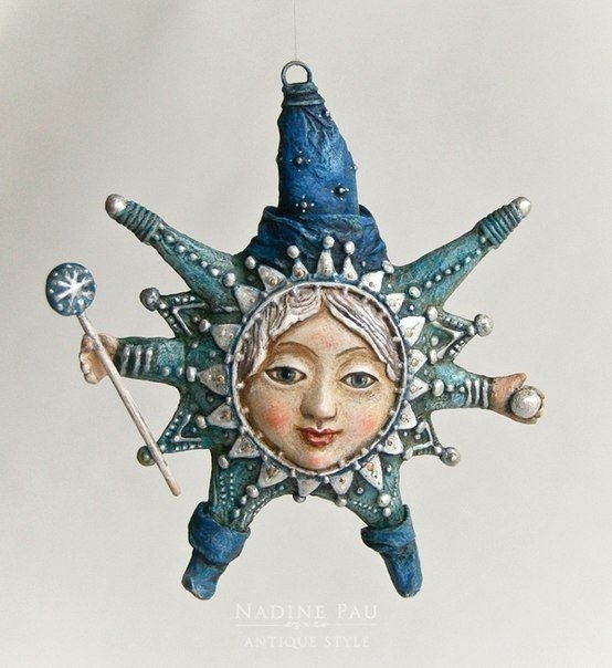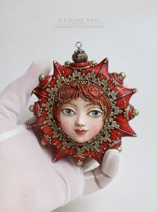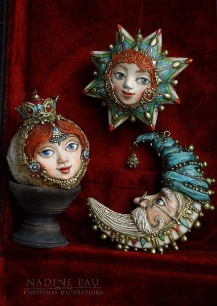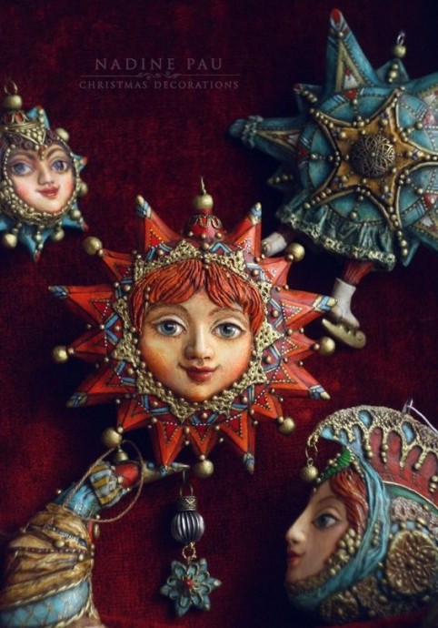 Наталья, эти изделия их полимерной глины или холодного фарфора. Рецепты холодного фарфора и глины можно найти на просторах интернета, а вот как делать это только ваша фантазия и немного опыта по работе с глиной. В интернете можно найти как вылепить лица куколок. Эти лица потом накладываются на плоские солнышки и оставляют сушить, а потом раскрашивают и покрывают лаком. Получаются такие ёлочные игрушки.