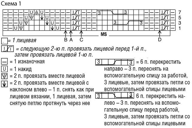 1 раппорт = 32 п. Вязать по схеме 1. На ней даны лицевые ряды. В изнаночных рядах петли провязывать по рисунку, накиды — лицевыми. Распределение петель узоров в ширину приведено в описании деталей. В высоту повторять с 1-го по 8-й р.