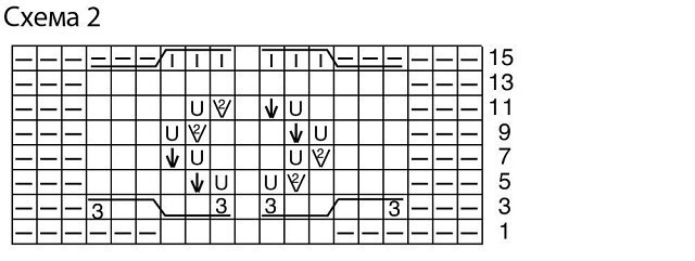 Вязать по схеме 2. В изнаночных рядах петли провязывать по рисунку, накиды — изнаночными. В высоту повторять с 1-го по 16-й р.
