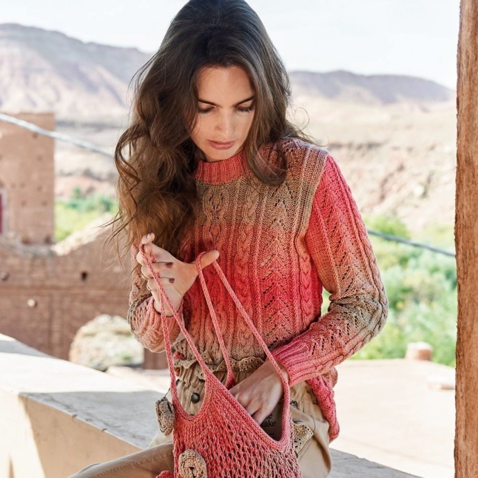 Пряжа секционного крашения (99% хлопка, 1% полиэстера; 280 м/50 г) — 650 г в коричнево-бежево-кораллово-красных тонах; спицы №3,5 и 4; круговые спицы №3,5.
