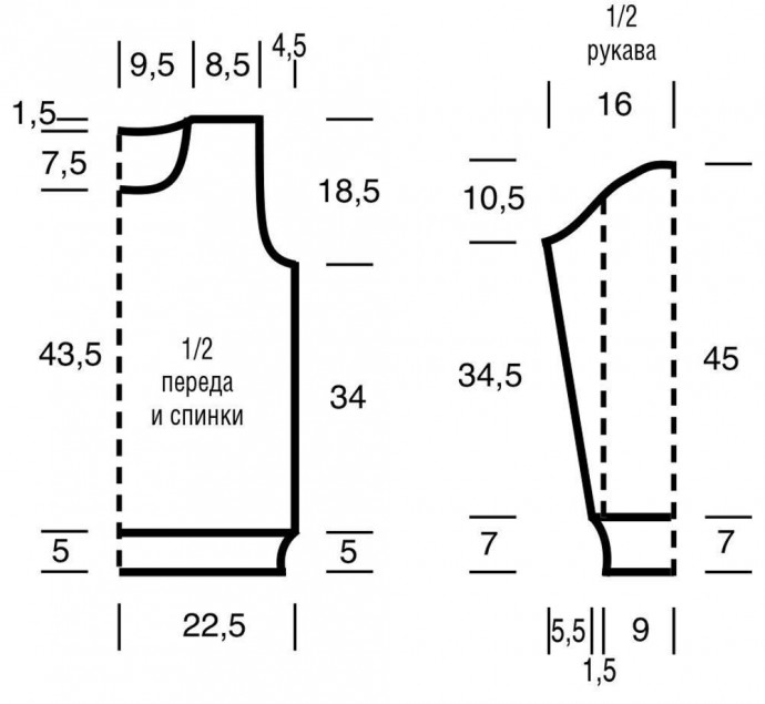 Вязать, как спинку, но с более глубокой горловиной. Для этого через 43,5 cм = 144 р. от нижней планки закрыть средние 13 п. и для закругления горловины с внутреннего края в каждом 2-м р. 1 раз 4 п., 2 раза по 3 п., 3 раза по 2 п. и 4 раза по 1 п.
