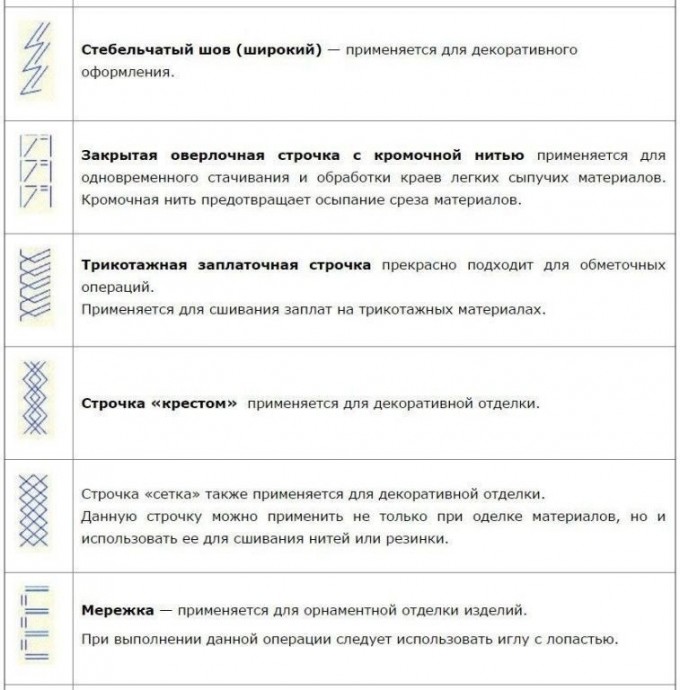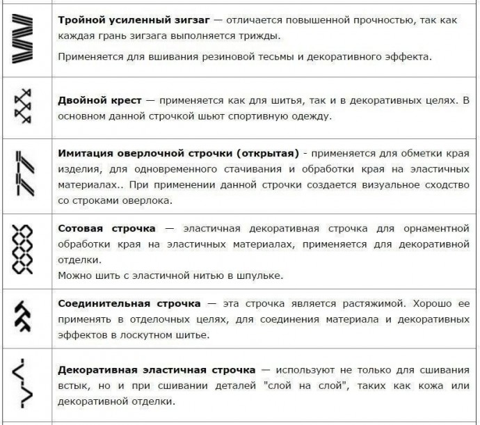 Без визуального восприятия трудно понять, что из себя представляют различные строчки. Давайте попытаемся расшифровать наиболее часто встречающиеся строки, которые есть практически на каждой швейной машинке. Как правило, для повседневного использования используется узкий набор видов строчек и операций. Чаще всего используется «оверлочная» строчка с применением специальной лапки, несколько разновидностей строчек зигзаг, прямая строчка. Остальные же строчки остаются лишь украшением панели выбора строчек и напоминанием о «хорошей» цене швейной машинки. Количество строчек современной машины варьируется от единиц до нескольких сотен в сложных компьютеризированных машинах. Строчки швейной машины принято разделять на рабочие и декоративные. Рабочие строчки К рабочим строчкам относят, помимо традиционной прямой строчки и зигзага, также оверлочные строчки, строчки для эластичных тканей, потайные строчки, строчки для стежки и т.п. В таблице приведены образцы полезных, рабочих строчек: