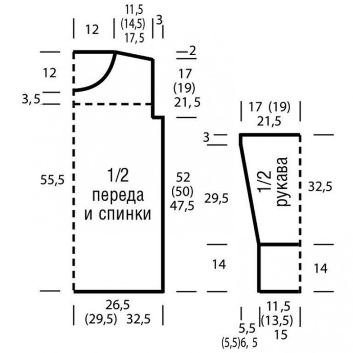 Набрать на спицы для каждого рукава по 43 (51) 55 петель и связать 1 изнаночный ряд лицевыми.
