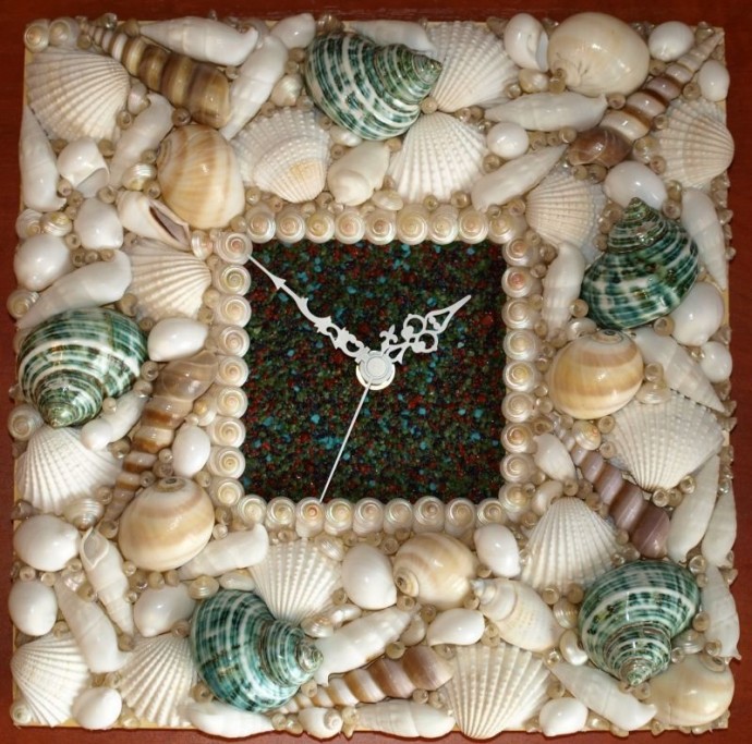 Кладем на рамку самые большие и яркие ракушки, закрепляем их клеем. Ракушки выкладываются по намеченному узору, примерно на одном расстоянии друг от друга. За ними выкладываются более мелкие ракушки, оставшееся пространство заполняется самой мелкой ракушкой.