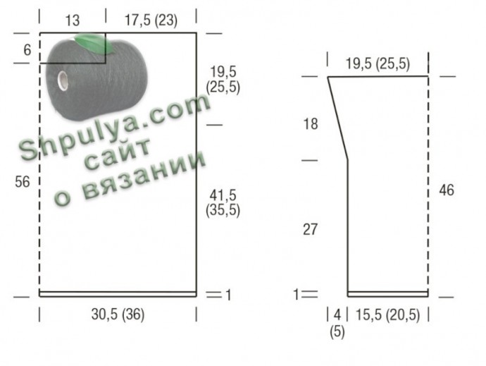 Вязать, как спинку, но с горловиной. Для этого через 55 см = 126 р. от планки закрыть средние 46 п. и обе стороны закончить раздельно. На высоте спинки с каждой стороны закрыть по 32 (41) оставшиеся петли.