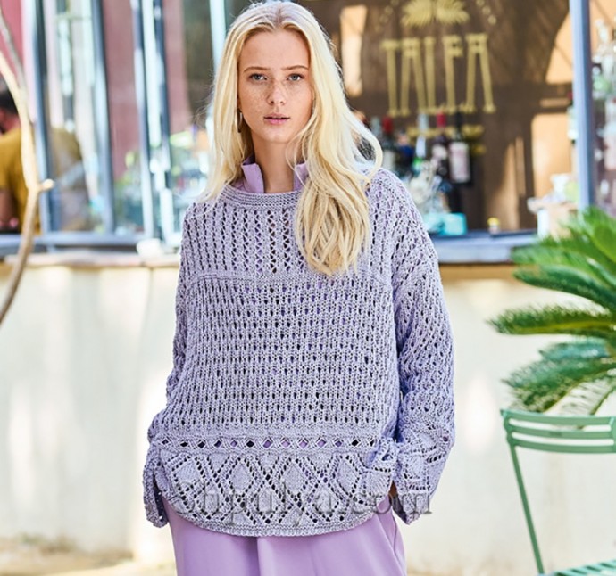 Вам потребуется: пряжа (100% хлопка; 90 м /50 г) — 600 (700) г светло-лиловой; спицы Ns 4; круговые спицы № 3,5.