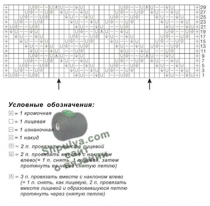 Узор «Ромбы». Количество петель кратно 18 + 1 п. + 2 кромочные. Вязать по схеме. На ней приведены только лицевые ряды; в изнаночных рядах петли вязать по рисунку, накиды провязывать изнаночными. Начать с петель перед правой стрелкой, раппорт между стрелками постоянно повторять и закончить петлями после левой стрелки.