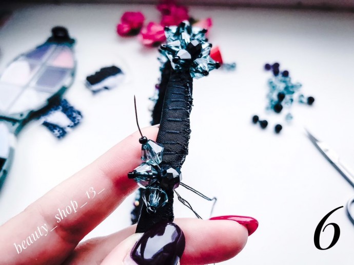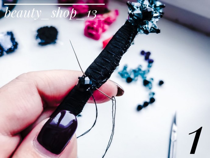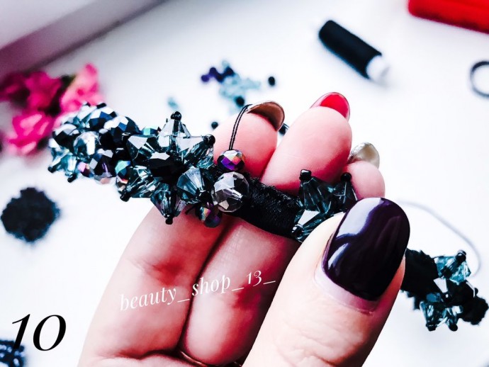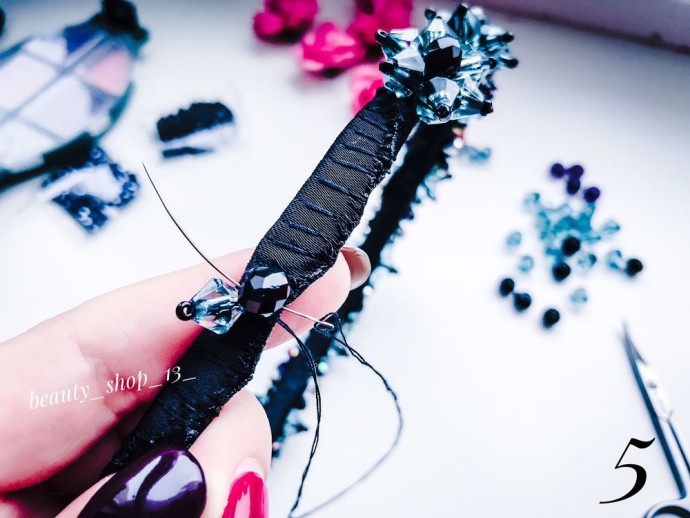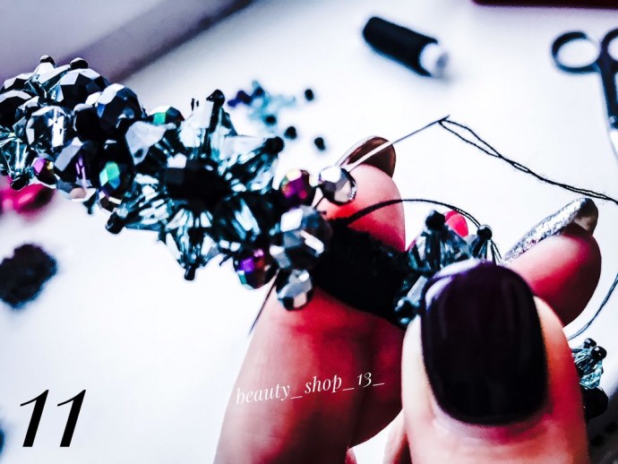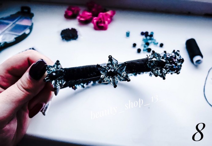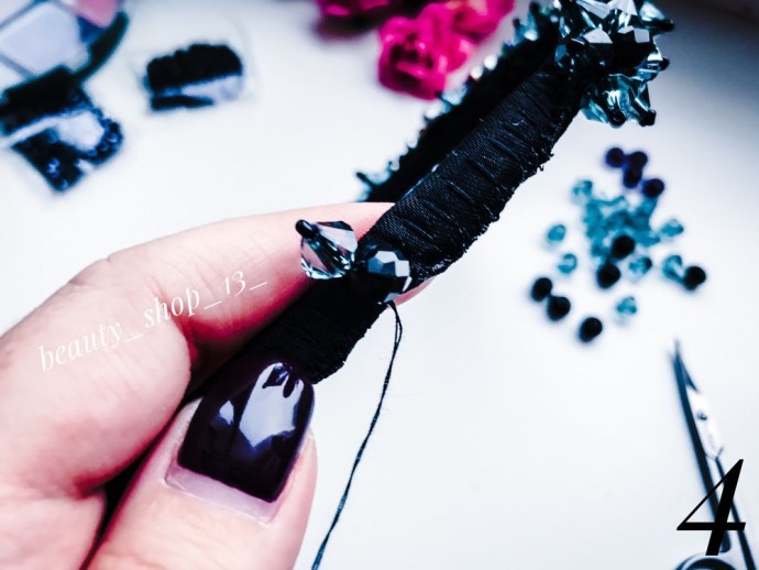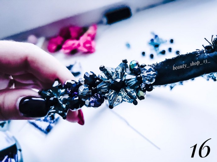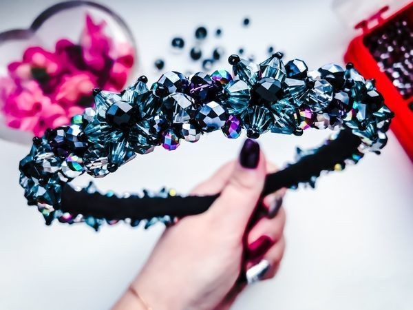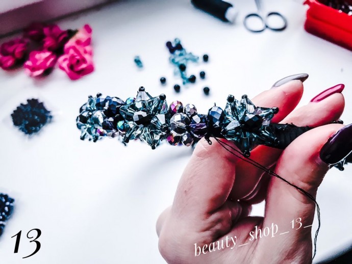 Материалы: хрустальные бусины, ромбовидные бусины, основа для ободка, нитки полиэстр, игла бисерная, напёрсток, бисер мелкий, бисер крупный, ножницы, клей момент