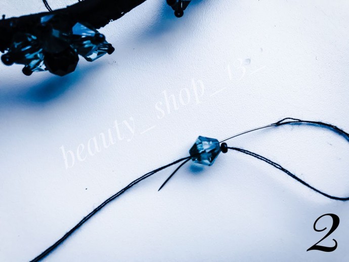 2. Берем ромбовидную бусину акриловую и 1 бисер мелкий, нанизываем ромбовидную бусину, затем бисер и как на фото проходим через бусину. Получается такая конструкция.