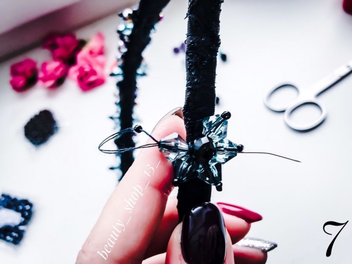 1. Берем рондель 8 мм и начинаем пришивать по серединке ободка. Выводим рядом иголку, как показано на фото. Заготовку для ободка я купила металлическую, продаётся в «Леонардо», и обшила его тканью, как это сделать, можно посмотреть в интернете, ничего сложного, и все бусины которые пришиваем, проходим по два раза, чтобы лучше держались и не болтались.