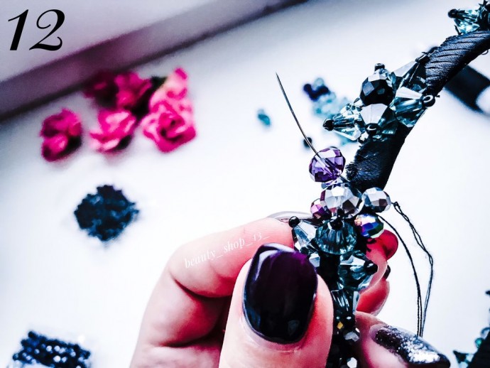 14-15. Заполняем по бокам оставшееся пространство ронделями 4 мм. Если между бусинами есть просветы, я заполняю их бисером крупного размера.