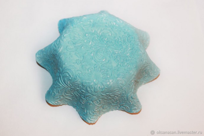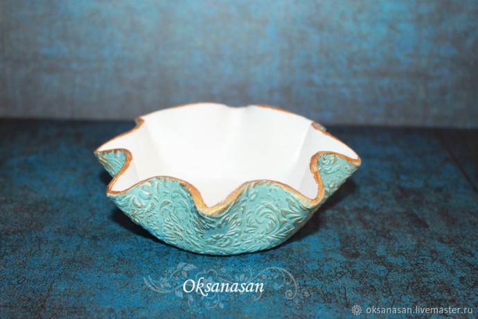 Если края затвердевшего изделия шершавые, обработайте их наждачной бумагой. На внешнюю сторону вазочки нанесите голубую акриловую краску.