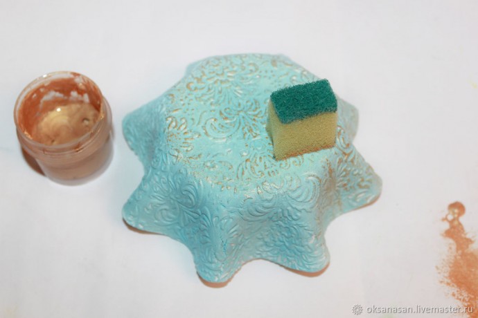 Когда голоубая краска высохнет, кусочком губки похлопывающими движениями нанесите золотую акриловую краску. После высыхания переверните вазочку и кисточкой нанесите краску по краю.