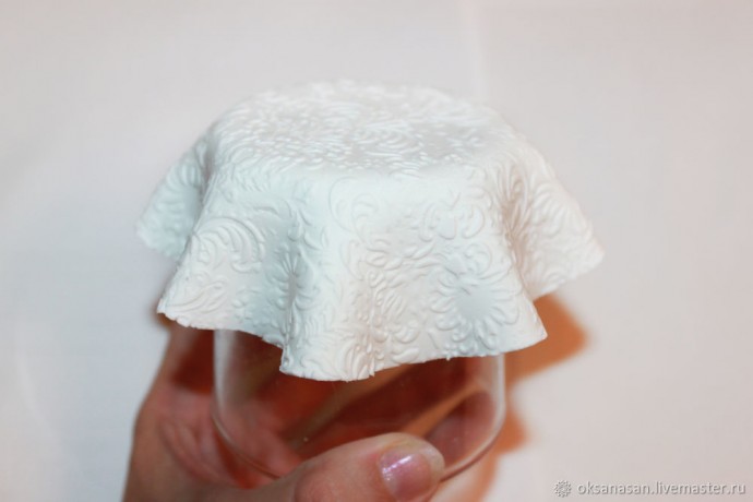 Поместите круглый пласт глины рисунком вверх на стакан точно по центру и сделайте одинаковые складки.