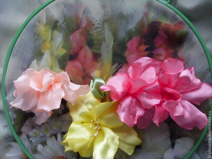 Той же зеленой лентой 2,5 см я от цветка я иду вверх, отступив 7-10 см и, протыкая иглой ленту, протягиваю ее на изнанку.