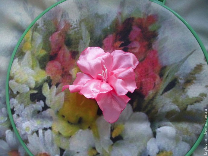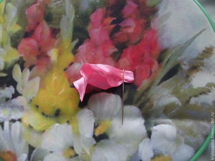 После того как подпалили, двумя пальцами берем за подпаленный край (осторожно, можно обжечь руки) и тянем один палец вверх, другой вниз, как на фото.Таким образом,у меня получаются фестончатые края,почти как у настоящего гладиолуса! И один секрет! Немного нужно опалить середину лепестка,с изнанки ленты,чтобы он закруглился. Вот такой лепесток вставляем в иглу с широким ушком и вшиваем в ткань.