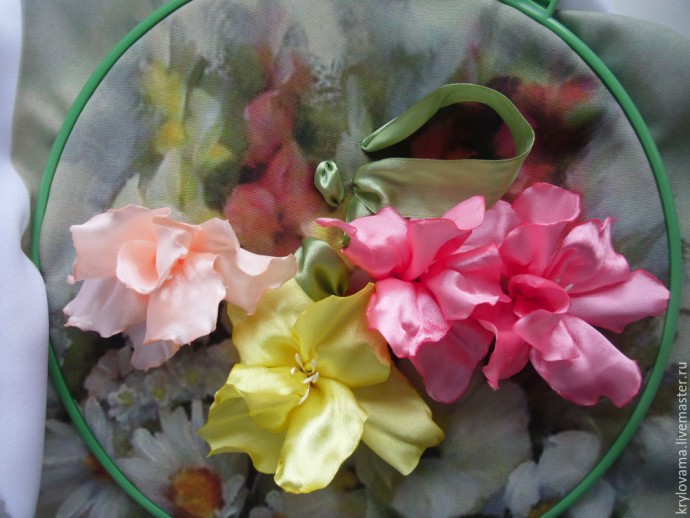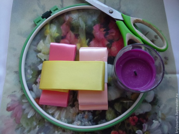 Материалы: ленты атласные, нитки, пяльца, ткань, игла, ножницы, свеча