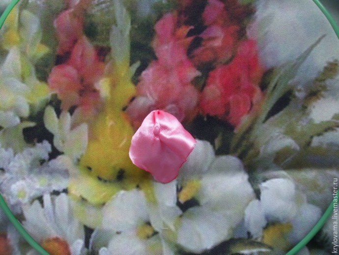 Вышили. Теперь берем ленту 5 см и вырезаем круги, также обжигаем края и слегка тянем вверх-вниз. Это будут нераскрывшееся бутоны.
